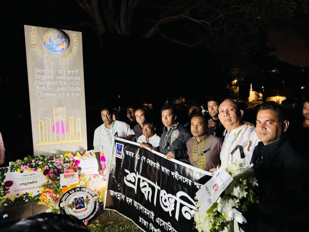 সিডনি, অস্ট্রেলিয়া – ২১ ফেব্রুয়ারি ২০২৫: অস্ট্রেলিয়ার জগন্নাথ হল অ্যালামনাই অ্যাসোসিয়েশন একুশে ফেব্রুয়ারি ২০২৫ উপলক্ষে এক বিশেষ অনুষ্ঠানের আয়োজন করে ভাষা শহীদদের প্রতি শ্রদ্ধা নিবেদন করেছে। স্থানীয় সময় রাত ১২টা ১ মিনিটে সংগঠনের সদস্যরা শহীদ মিনারের প্রতীকী স্থানে পুষ্পস্তবক অর্পণ করেন এবং ভাষা আন্দোলনের বীর শহীদদের স্মরণে এক মিনিট নীরবতা পালন করেন।